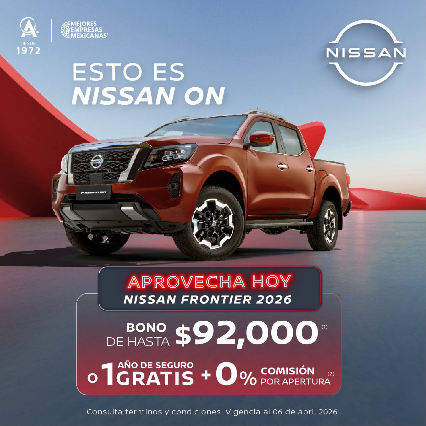 Se aplica para FRONTIER SE TM '26 en operaciones de crédito celebradas con Credi Nissan (No aplica a otras promociones). (2) Aplica para todas las versiones Frontier 2026 en operaciones de crédito celebradas con Credi Nissan. No aplica con otras promociones ni en compra de flotillas. Para conocer planes y modalidades de crédito, verificar precios, requisitos de contratación, comisiones, disponibilidad, términos y condiciones, consulta a tu Distribuidor Autorizado Nissan. Vigencia del 6 de abril de 2026.