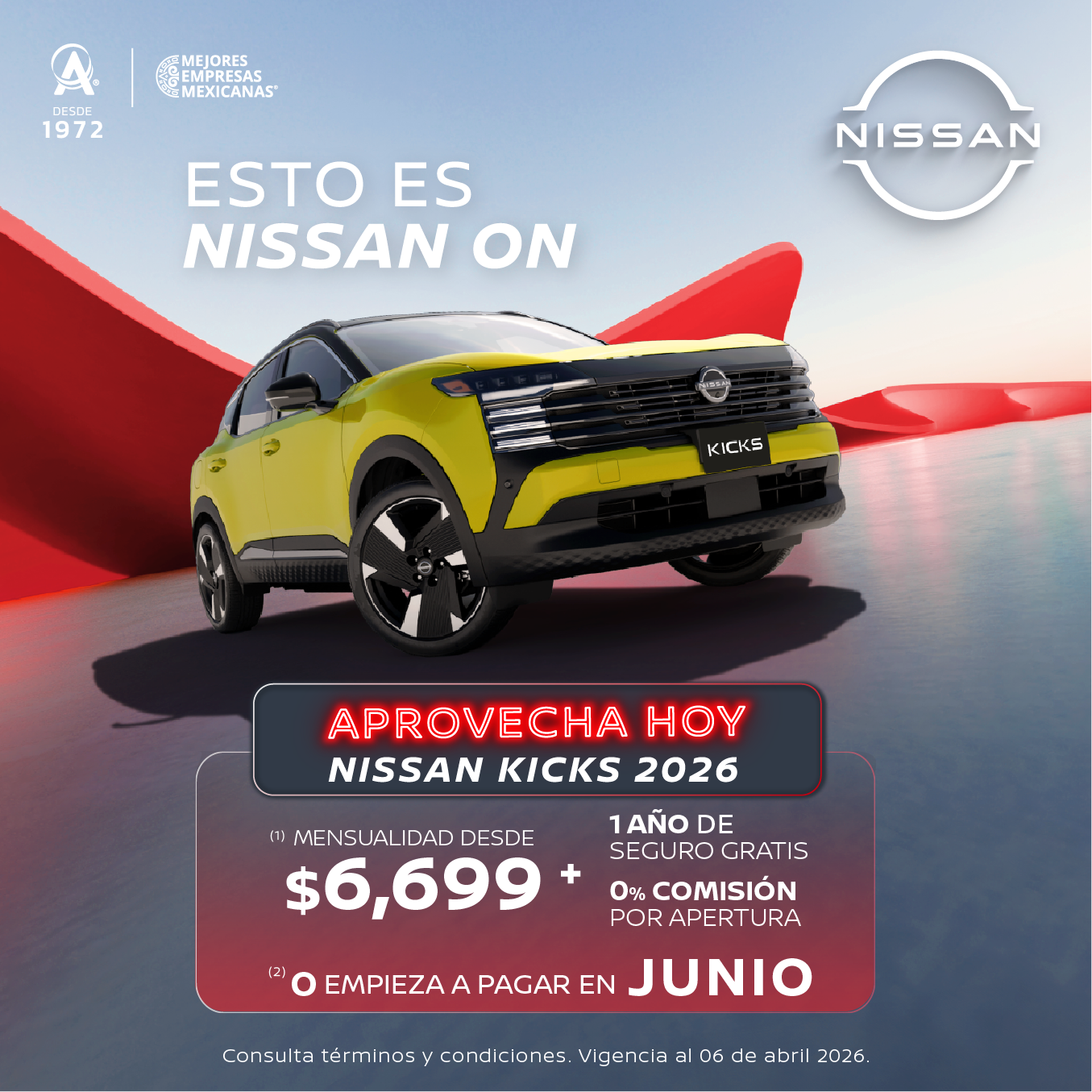 Se aplica para KICKS ADVANCE CVT 26 en plan tradicional Credi Nissan con el 40% de enganche a 72 meses, 1 año de seguro gratis y 0% comisión por apertura. Tasa anual de 9.04% y CAT promedio sin IVA de 10.2%. (2) Aplica para todas las versiones Kicks 2025 en operaciones de crédito celebradas con Credi Nissan. No aplica con otras promociones ni en compra de flotillas. Para conocer planes y modalidades de crédito, verificar precios, requisitos de contratación, comisiones, disponibilidad, términos y condiciones, consulta a tu Distribuidor Autorizado Nissan. Vigencia al 6 de abril de 2026