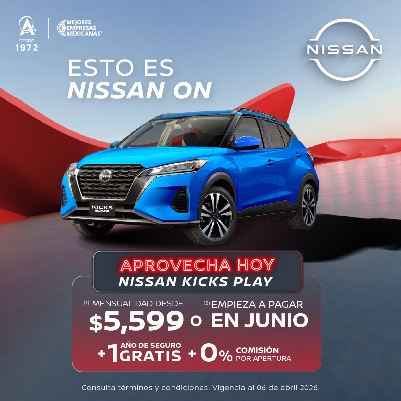 Se aplica para KICKS PLAY ADVANCE 25 en plan tradicional Credi Nissan con el 40% de enganche a 72 meses. (2) Aplica para el modelo Kicks Play 2025 en operaciones de crédito celebradas con Credi Nissan con un enganche desde el 20%. No aplica con otras promociones ni en compra de flotillas. Para conocer planes y modalidades de crédito, verificar precios, requisitos de contratación, comisiones, disponibilidad, términos y condiciones, consulta a tu Distribuidor Autorizado Nissan. Vigencia del 6 de abril de 2026.