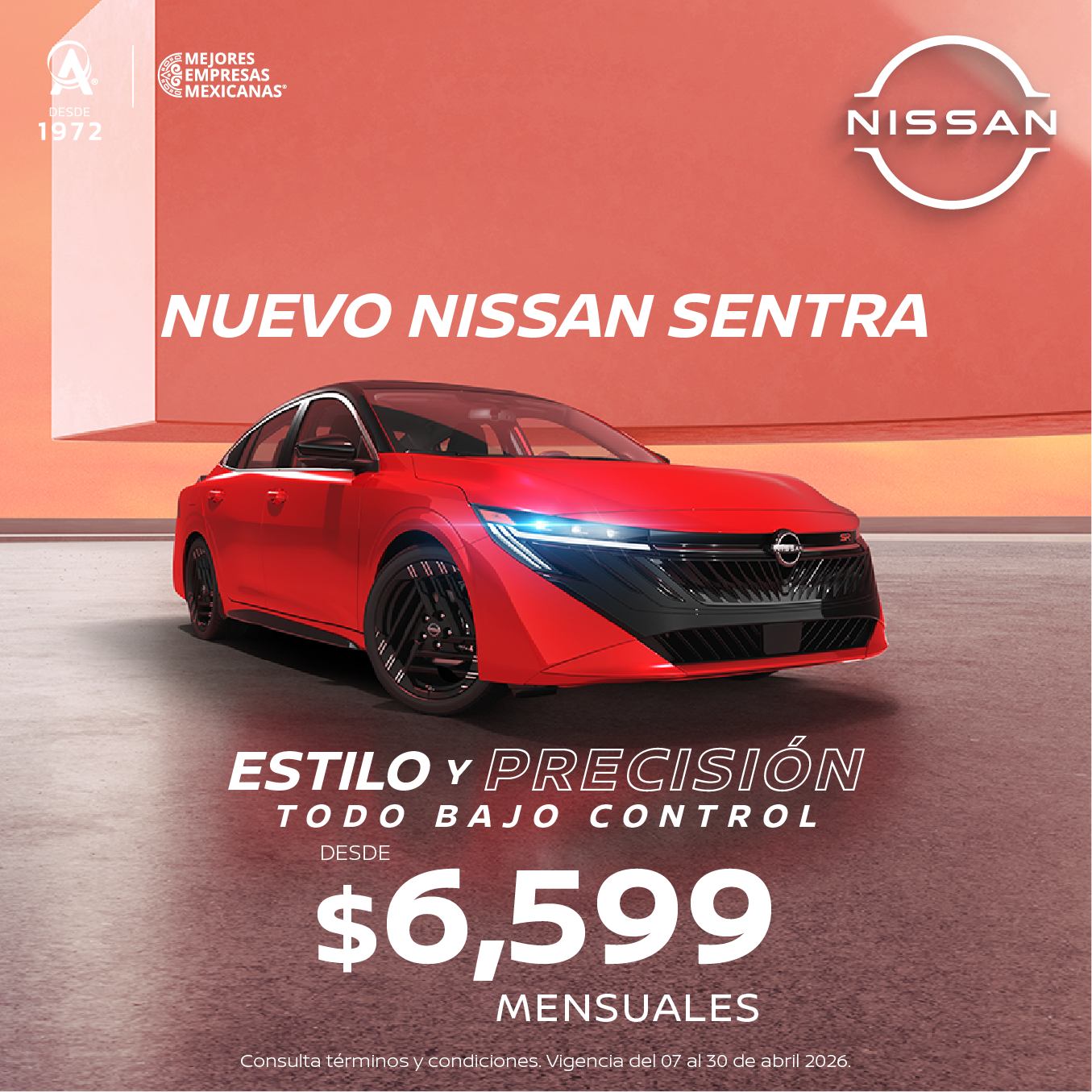 Aplica para SENTRA SENSE CVT ‘26 en operaciones de crédito con el plan Crédito Nissan con el 43% de enganche a un plazo de 60 meses. No aplica con otras promociones ni en compra de flotillas. Para conocer planes y modalidades de crédito, verificar precios, requisitos de contratación, comisiones, disponibilidad, términos y condiciones, consulta a tu Distribuidor Autorizado Nissan. Vigencia del 07 al 30 de abril 2026.
